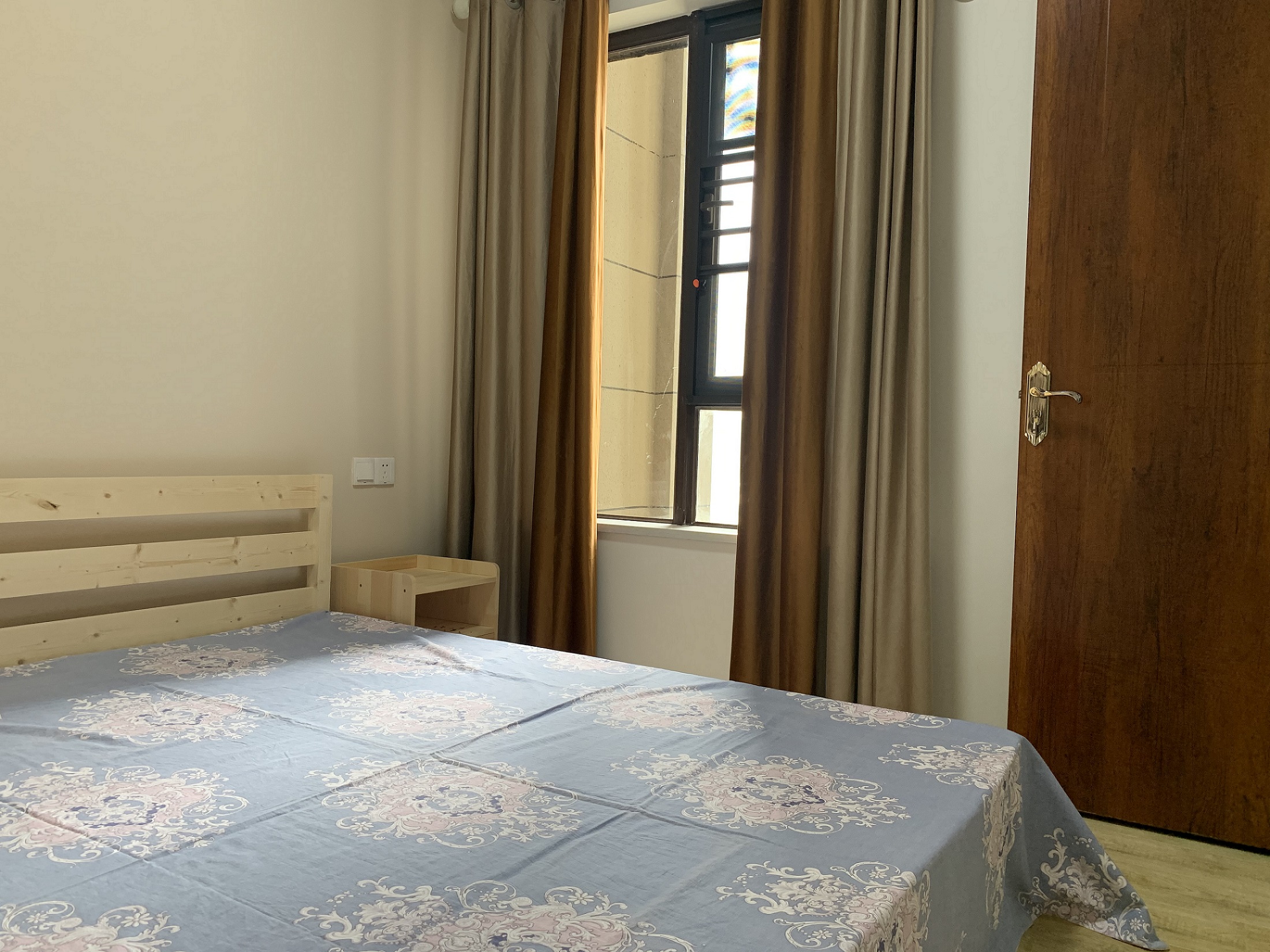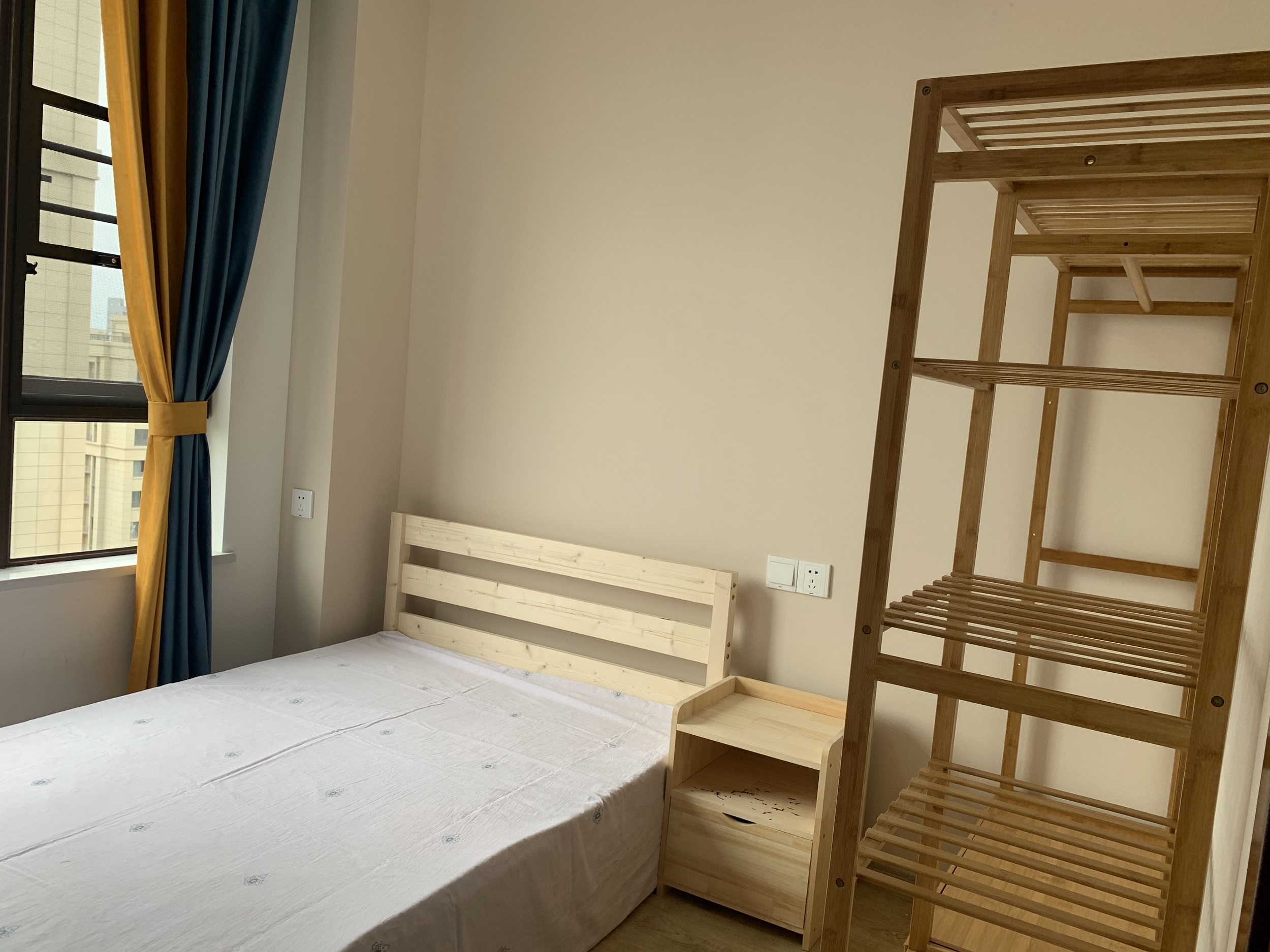 卧室布置简约之至,木色床架和家具尽显清晰自然质感,在简约浅黄的墙面、窗帘,打造出舒适的睡眠空间。