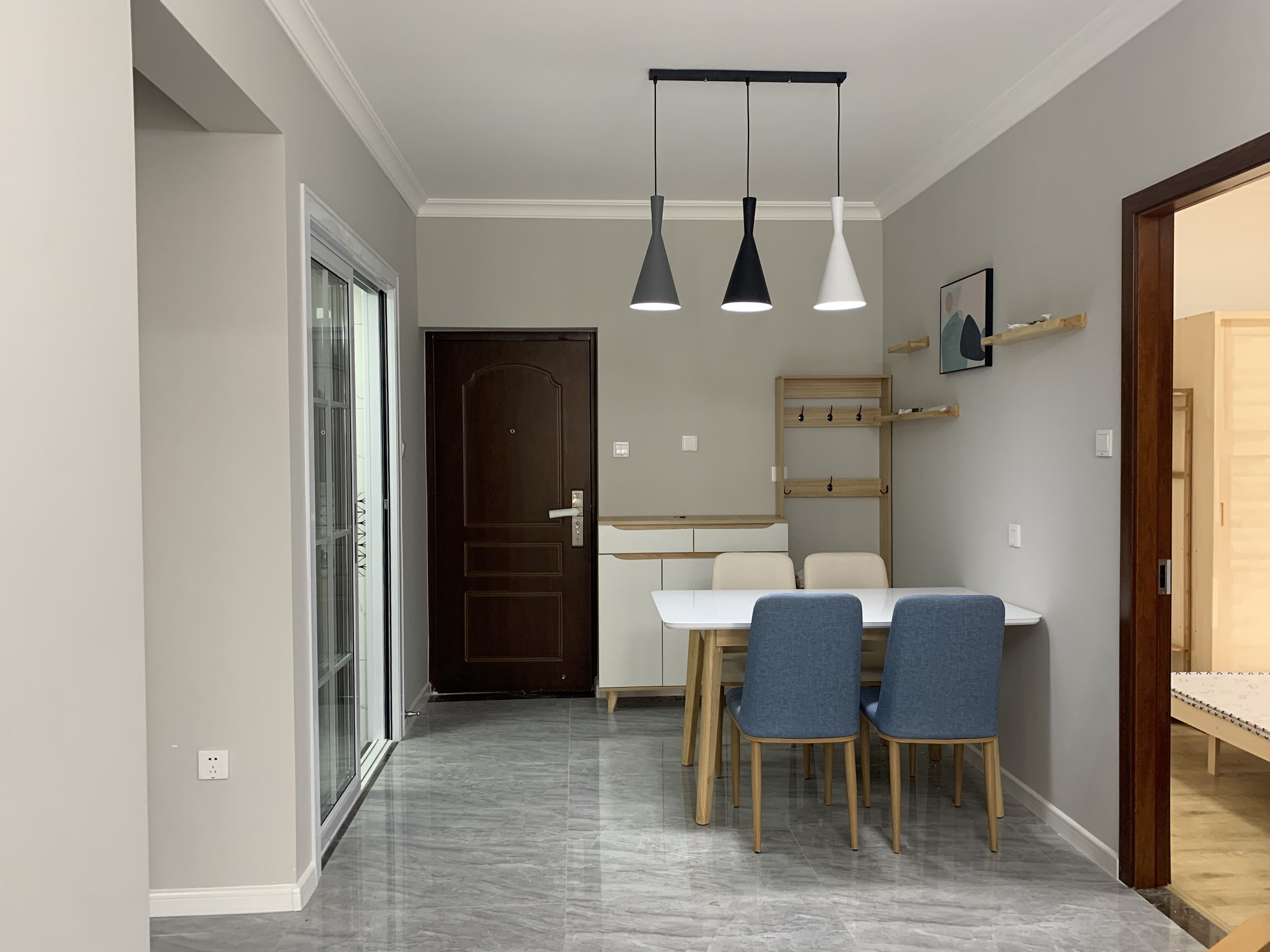餐厅格局以极简+木色为主,白色餐桌搭配白兰座椅,简约大方。